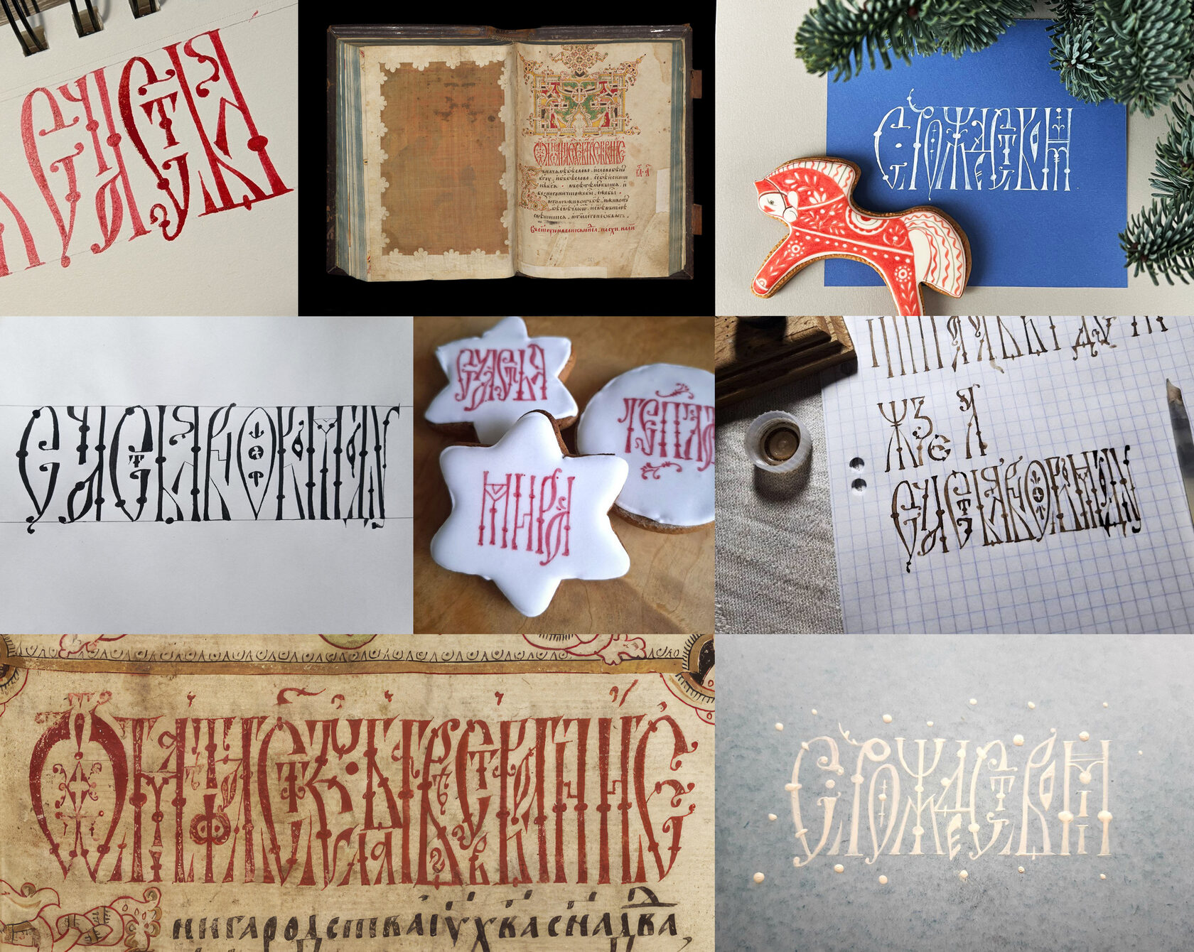 На мастер-классе мы рассмотрим четыре вязевых заголовка евангелия, обсудим, какие черты определяют их яркий характер, освоимся со сложной «рисованной» техникой письма, выясним, что же делать, если каких-то букв в образце нет, и сочиним одну или несколько надписей, которые могут украсить подарок по случаю Рождества.