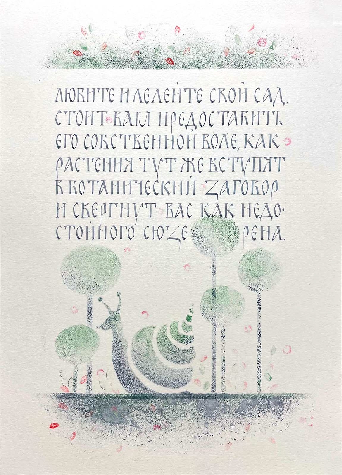 На курсе ученики пропишут каждую букву кириллического алфавита кистью и пером, сделают на их основе орнаментальные упражнения, затем перейдут к написанию не больших по объему текстов и поработают над адаптированной копией фрагмента страницы из Остромирова Евангелия. Параллельно с изучением букв уставного письма слушатели знакомятся с различными видами орнаментальных буквиц, которые традиционно располагались на страницах рукописных книг. Несколько занятий посвящены расширенной работе с буквенной формой и композицией листа. В конце курса предполагается выполнение итоговой работы.